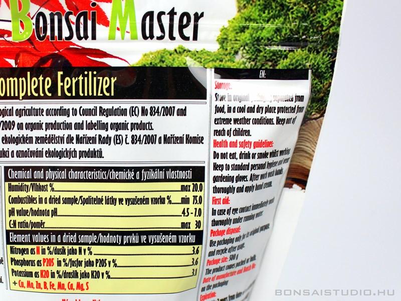 Kültéri bonsai fákhoz ajánlott bonsai tápanyag granulátum. Szeves, komplex készítmény, mely NPK aránya 3,6 - 3,6 - 3,1. Felhasználási időszaka a tavaszi indító trágyázástól/tápozástól a nyár végéig terjed (javasolt figyelembe venni a lebomlási időt). Alkalmazásánál elegendő a talajfelszínre szórni vagy tápanyag tartó kosarakba helyezni, ne keverjük bele külön az ültető közegbe.